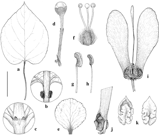 Stigmaphyllon sundaicum. a. Leaf. b. Base of lamina and apex of petiole with pair of glands. c. Node with triangular stipules. d. Flower bud with peduncle and pedicel. e. Petal. f. Gynoecium of hermaphroditic flower. g. Distal portion of stamen from male flower. h. Distal portion of stamen from hermaphroditic flower. i. Fruit, with samaras beginning to separate. j. Base of samara to show broad carpophore. k. Embryo, front and back. Scale bar equivalents: a, 4 cm; b, 4 mm; c, 8 mm; d, 4 mm; e, 5 mm; f–h, 2.7 mm; i, 1.3 cm; j, 8 mm; k, 5 mm. Based on: a, b, e, f, h, Mitchell 7241, BRI; c, d, g, Jaag 349, L; i–k, Afriastini 1554, K. Drawn by Karin Douthit. First published by C. Anderson in Blumea 56: 99. 2011.