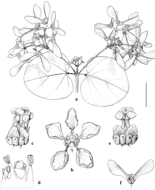 Stigmaphyllon sinuatum. a. Fruiting branch. b. Flower. c. Flower, the petals removed. d. Portion of antroecium laid out, adaxial view, posterior stamen on extreme left, anterior stamen on extreme right. e. Flower with petals and androecium removed, anterior style in the center. f. Fruit with two samaras.