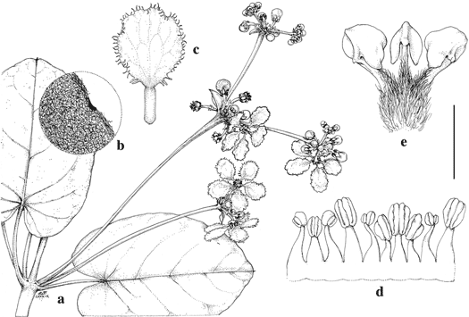 Stigmaphyllon stylopogon. a. Flowering branch. b. Detail of margin and abaxial surface of lamina. c. Posterior petal. d. Androecium laid flat, adaxial view, stamen second from left opposing the posterior petal. e. Gynoecium; posterior styles are bent slightly outward to show anterior style (in center). Scale bar equivalents: a, 4 cm; b, 2 mm; c, 8 mm; d, e, 4 mm. Based on Cid et al. 4648. Drawn by Karin Douthit. First published by C. Anderson in Contr. Univ. Michigan Herb. 17: 18. 1990.