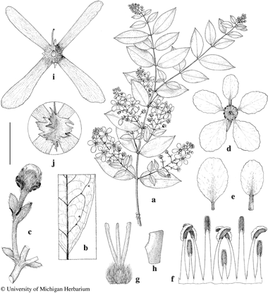 Glicophyllum maranhamense. a. Flowering branch. b. Base of lamina, abaxial view to show glands in surface. c. Flower bud, with large glands on bracteoles. d. Flower, posterior petal uppermost. e. Petals, abaxial view, lateral petal (left) and posterior petal (right). f. Androecium laid flat, abaxial view, the shortest stamen opposite posterior petal. g. Gynoecium, the anterior style in middle. h. Distal portion of a posterior style. i. Samara, adaxial view. j. Nut of samara, abaxial view.