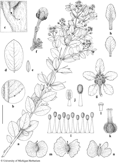 Glicophyllum microphyllum. a. Flowering branch. b. Base of lamina, abaxial view, to show marginal glands. c. Node, with epipetiolar gland and minute interpetiolar stipule. d. Detached large leaf, abaxial view. e. Detached small leaf, adaxial view. f. Flower bud, with portion of inflorescence axis. g. Flower, posterior petal uppermost. h. Petals, posterior above, lateral below. i. Androecium laid out, abaxial view, the stamen fifth from left opposite posterior petal. j. Anthers, adaxial view (left) and abaxial view (right). k. Gynoecium. l. Apex of style. m. Samaras, adaxial view. n. Samara, abaxial view. Scale bar equivalents: a, 4 cm; b, 8 mm; c, 4 mm; d, e, 4 cm; f, g, 8 mm; h, 6.7 mm; i, 4 mm; j, 2 mm; k, 2.7 mm; l, 1.3 mm; m, n, 1.3 cm. Based on: a, b, f, Irwin et al. 28677, MICH; c, d, Anderson 11541, MICH; e, Irwin et al. 9389, MICH; g–l, Maguire et al. 49026, MICH; m, n, Irwin et al. 22473, MICH. Drawn by Karin Douthit. © University of Michigan Herbarium.
