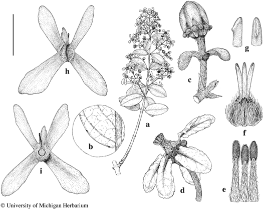 Glicophyllum vacciniifolium. a. Flowering branch. b. Base of lamina, abaxial view, showing marginal glands. c. Flower bud. d. Flower, lateral view, posterior petal uppermost. e. Three stamens, abaxial view. f. Gynoecium. g. Stigmas, lateral view (left) and adaxial view (right). h. Samara, abaxial view. i. Samara, adaxial view. Scale bar equivalents: a, 4 cm; b–d, 4 mm; e, f, 2 mm; g, 0.8 mm; h, i, 6.7 mm. Based on: a–g, Bunting 10469, MICH; h, i, Wingfield 13017, MICH. Drawn by Karin Douthit. © University of Michigan Herbarium.