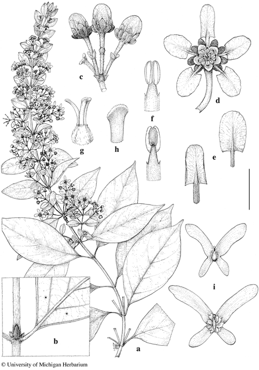 Scale bar equivalents: a, 4 cm; b, c, 8 mm; d, 5.7 mm; e, 4 mm; f, 2 mm; g, 3 mm; h, 1 mm; i, 2 cm. Based on: a–h, Tillett & Tillett 45689, MICH; i, Hoffman 3746, MICH. Drawn by Karin Douthit. © University of Michigan Herbarium.