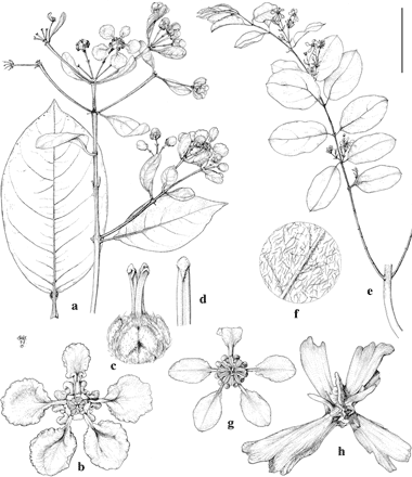 Tetrapterys megalantha and Glicophyllum aristeguietae. a–d, T. megalantha. a. Flowering branch, and abaxial view of detached large leaf. b. Flower, posterior petal uppermost. c. Gynoecium. d. Distal portion of style, adaxial view. e–h, G. aristeguietae. e. Flowering branch. f. Enlargement of abaxial surface of lamina. g. Flower, posterior petal uppermost. h. Samara, abaxial view. Scale bar equivalents: a, 4 cm; b, 1.5 cm; c, 3.3 mm; d, 2 mm; e, 4 cm; f, 4 mm; g, 5 mm; h, 5.7 mm. Based on: a–d, Tillett & Tillett 45871, MICH; e–h, Aristeguieta 4867, VEN. Drawn by Karin Douthit. First published by W. R. Anderson in Mem. New York Bot. Gard. 32: 268. 1981.