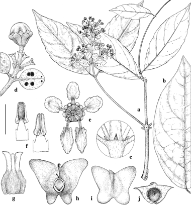 Scale bar equivalents: a, b, 4 cm; c, 4 mm; d, e, 5.7 mm; f, g, 2 mm; h–j, 1.3 cm. Based on: a, c–g, Vester 700, MICH; b, i, j, Vester 744, MICH; h, Díaz et al. 211, MO. Drawn by Karin Douthit. First published by W. R. Anderson in Contr. Univ. Michigan 25: 108. 2007.