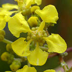 Tetrapterys natans. a. Flowering branch. b. Detached large leaf, adaxial view. c. Node with connate interpetiolar stipules. d. Umbel with one flower bud, the other three removed, subtended by reduced orbicular inflorescence leaves, the left showing adaxial surface, the right showing abaxial surface. e. Flower, posterial petal uppermost. f. Stamens, abaxial view (above) and adaxial view (right). g. Gynoecium, anterior style in center. h. Mericarp, adaxial view. i. Mericarp, abaxial view. j. Mericarp, cross-section, seed removed.