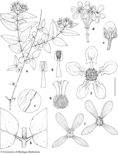 Tetrapterys schiedeana. a. Flowering branch. b. Node with stipules and adaxial view of leaf bases. c. Marginal leaf gland, abaxial view. d. Umbel. e. Flower bud. f. Flower, posterior petal uppermost. g. Stamens, adaxial view (left) and abaxial view (right). h. Gynoecium, anterior style in center. i. Samaras, adaxial view (left) and abaxial view (right).