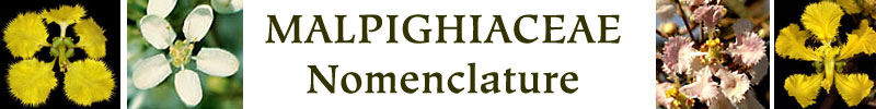 Search the Malpighiaceae Nomenclature Database: Search for any name Search for correct names only Search for types Genera: list all names or only correct names Search for synonyms of a particular correct name: of genera or species Explanatory notes on Nomenclature of the Malpighiaceae Correct names for commonly misnamed cultivated Malpighiaceae